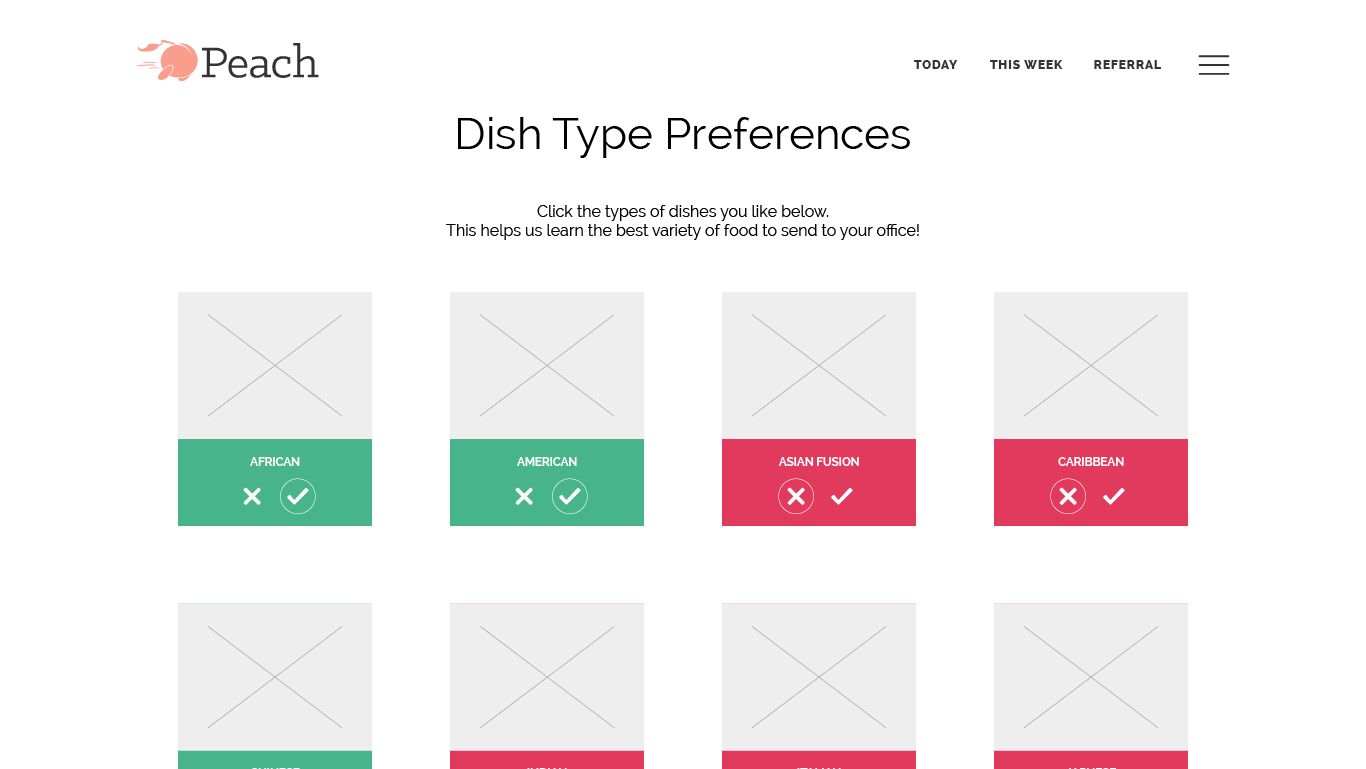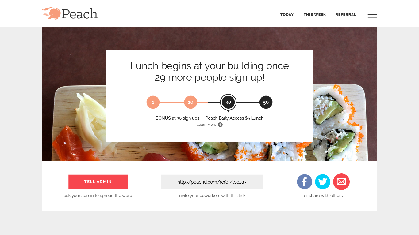 Peach requires a certain number of users to begin lunch deliveries to an office. This page is shown to those users when they’ve signed up for Peach but their office needs more users to start delivery. The goal was to provide status and incentivize users to refer others to sign up.