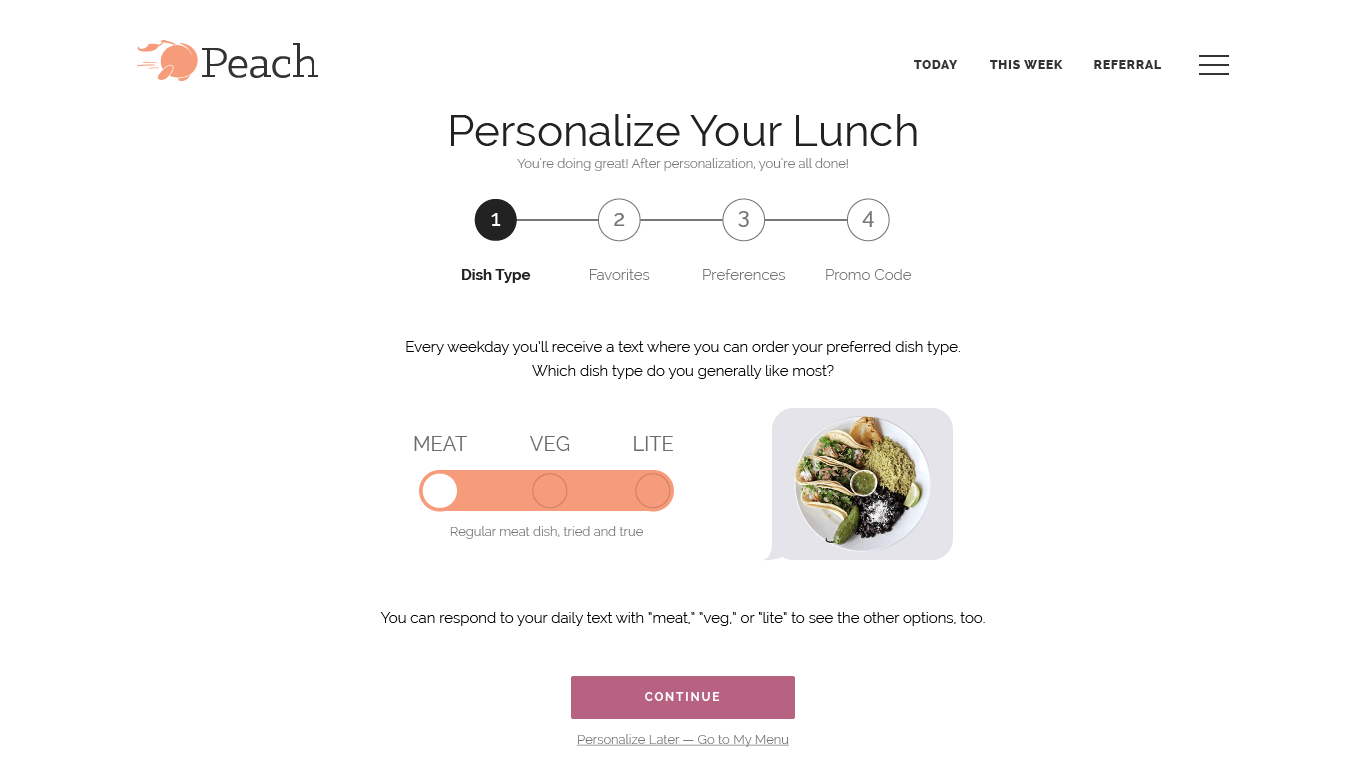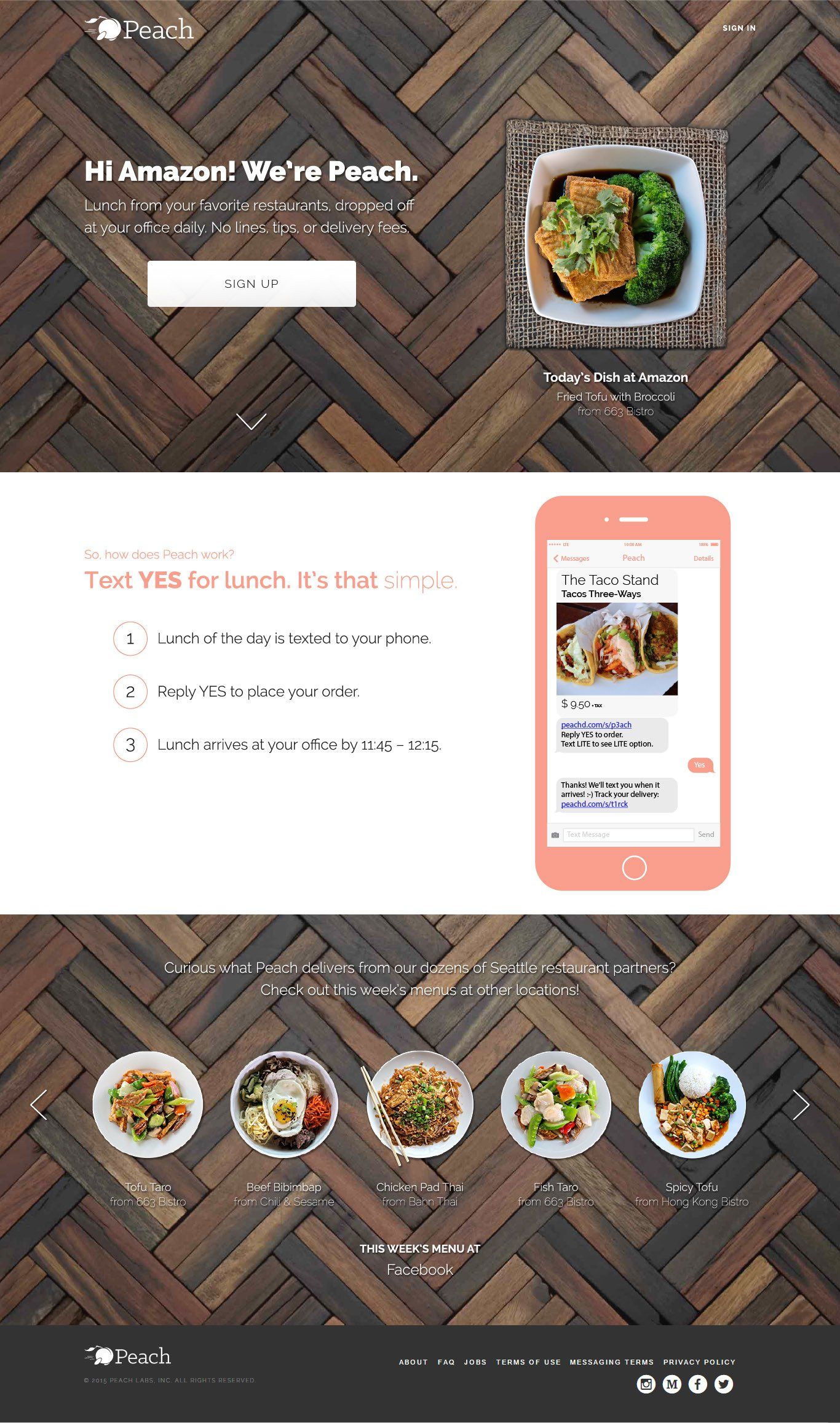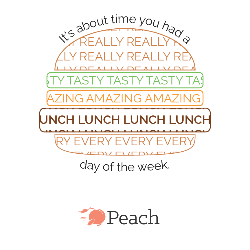 Peach delivers lunch from your favorite local restaurants directly to your office's front desk between 12:00 – 12:30 pm every weekday. The daily dish, rotated daily from restaurant to restaurant for variety, is texted to you every weekday morning. To place your order, simply respond "yes" to that text. The service is run primarily through an SMS/MMS texting model with web counterparts. Businesses and delivery drivers have apps to use.