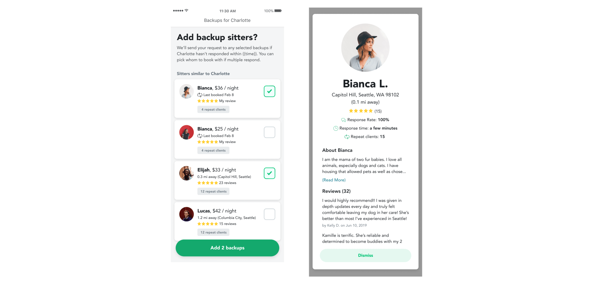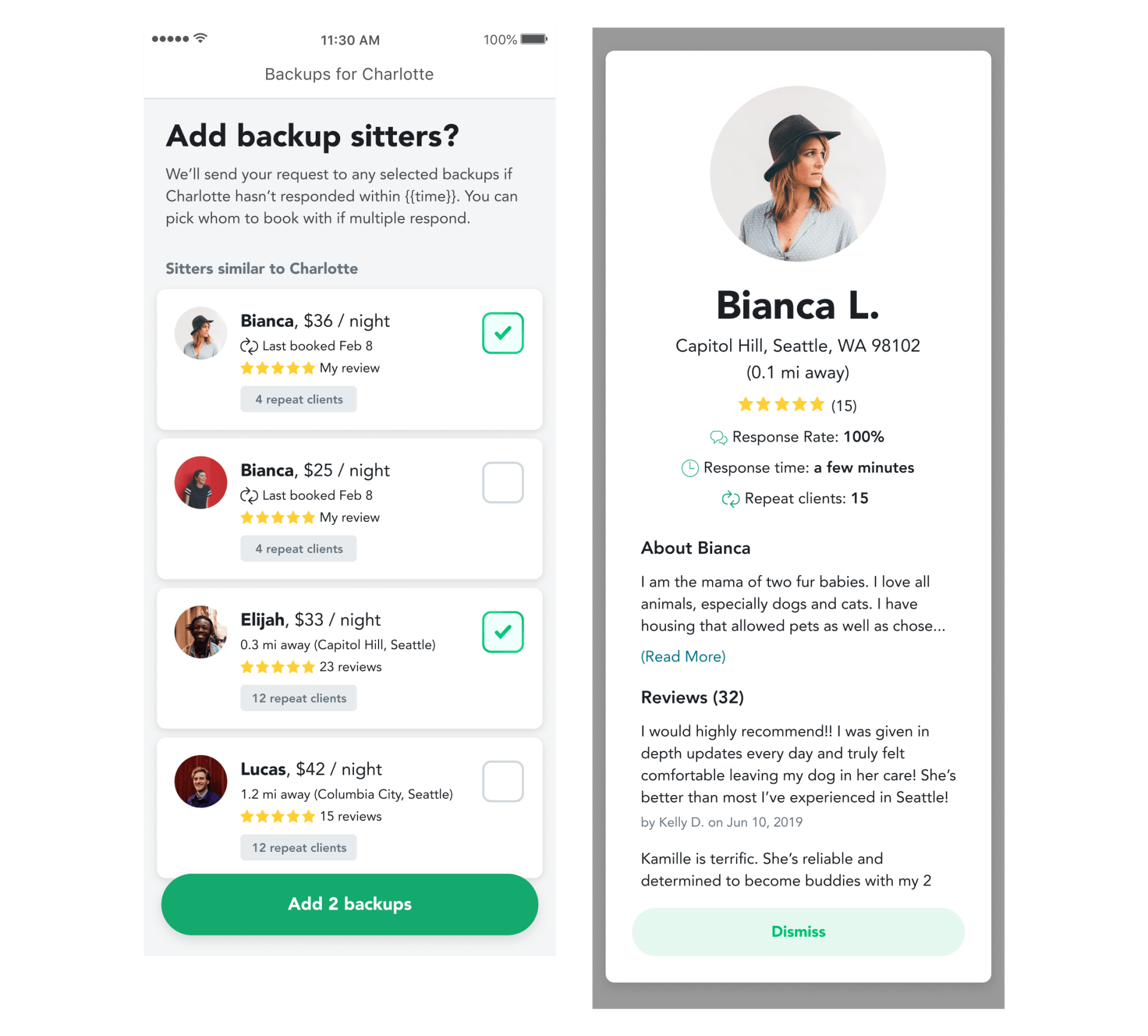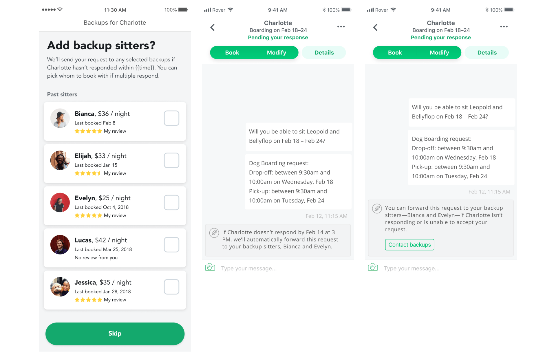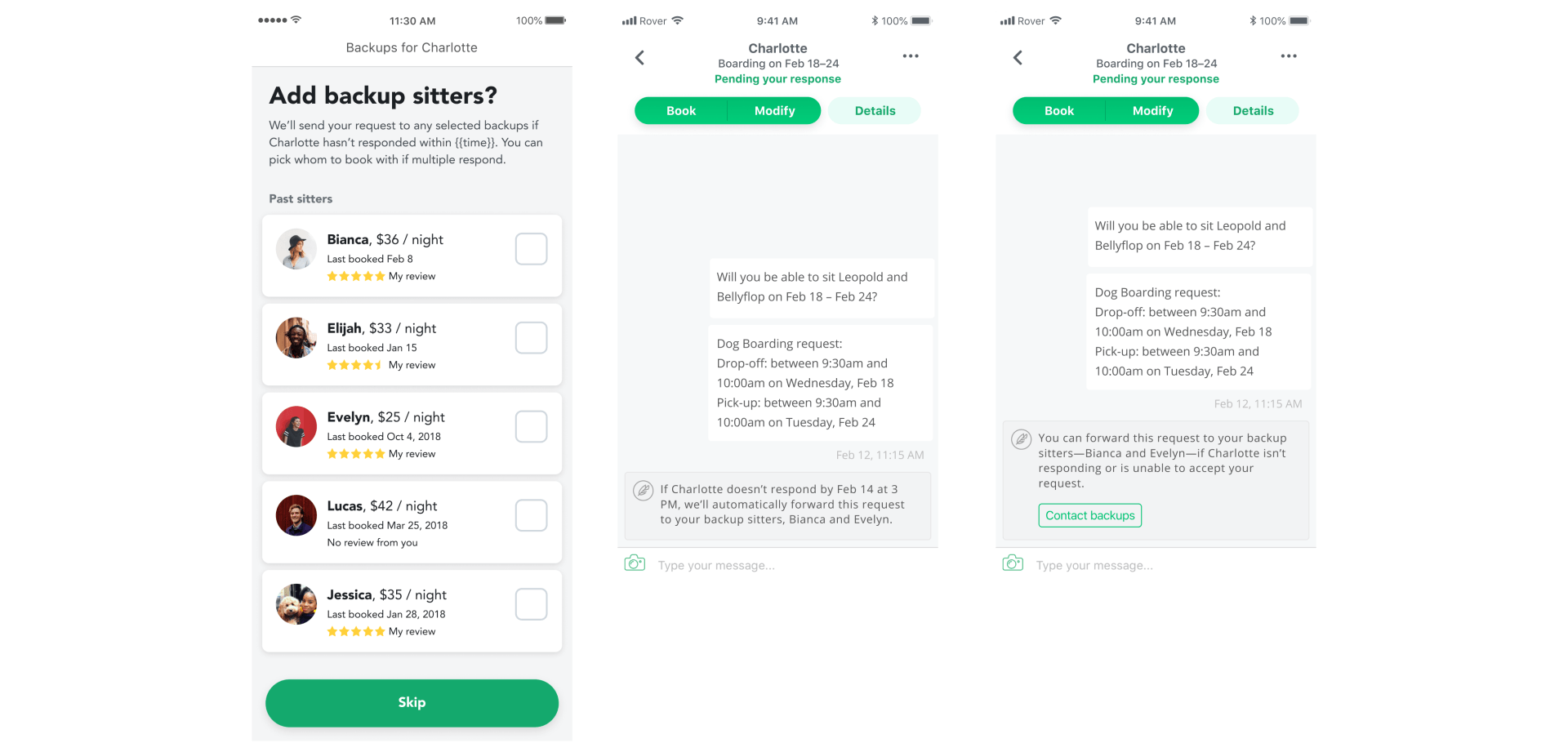 When booking a sitter, the small % of owners in our test group could optionally pick a backup sitter and see information about it in the sitter conversation—the cheapest way we could find to test this concept meaningfully.