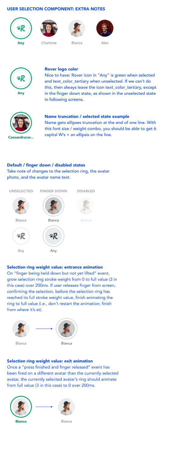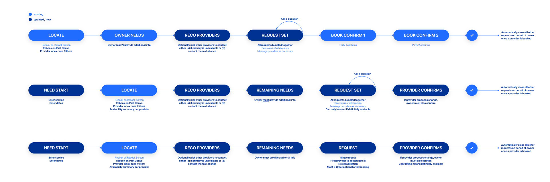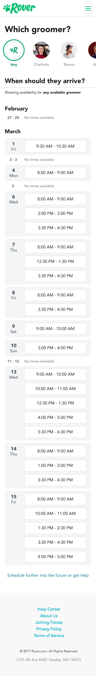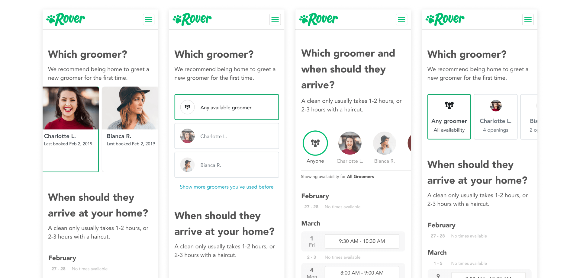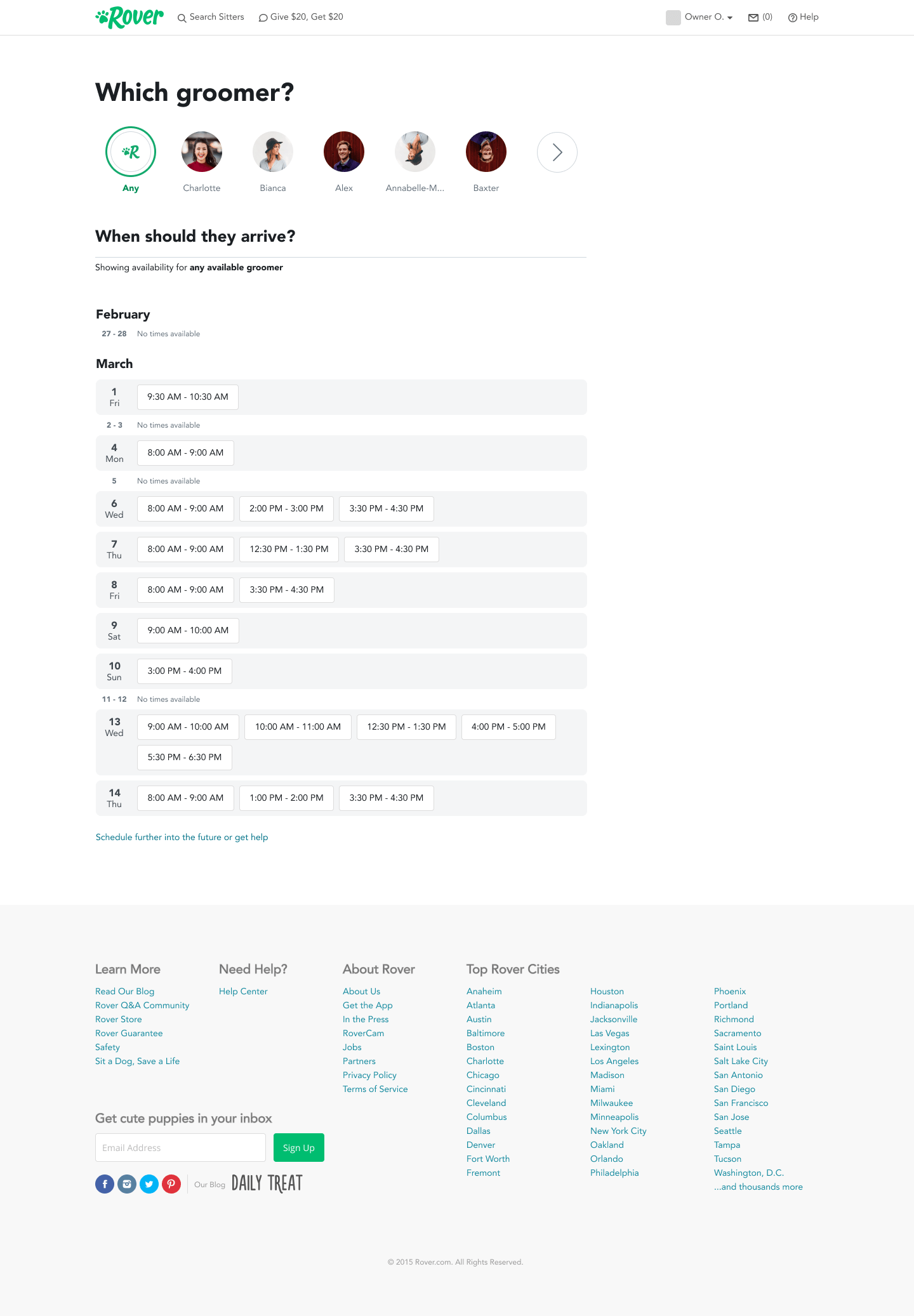 For the Rover grooming business line I designed, we created a calendar system where owners could view and pick from available grooming times while booking online. After, we added the requirement that owners could also choose to book specific groomers they'd used in the past.
