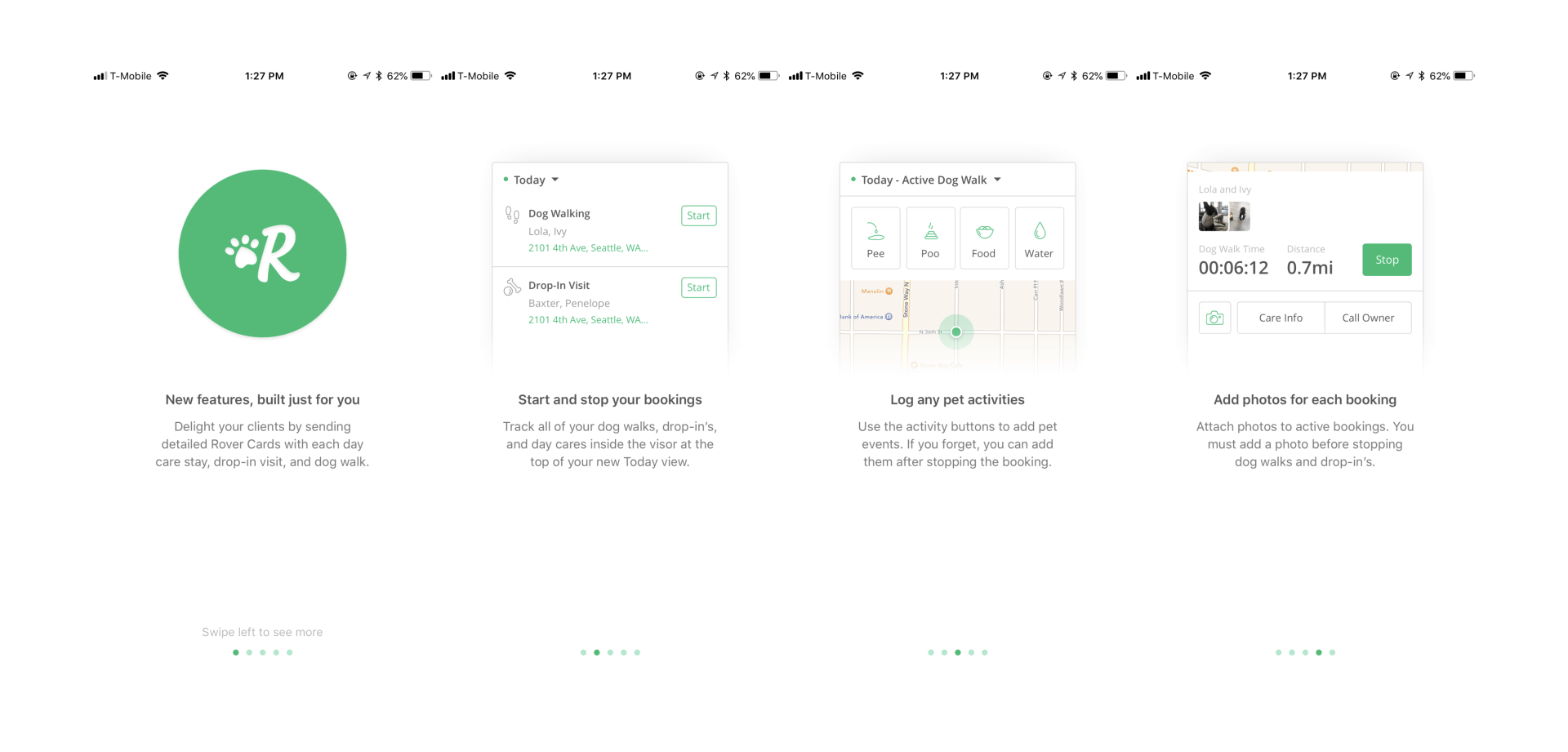 Sitters start a walk from a list, when they have walks scheduled with an owner. Once started, they can pick dog during the walk like pooping (everybody's favorite to learn about), take photos, and leave notes. All of this information, plus an extra note at the end, gets added to the Rover Card the owner receives.